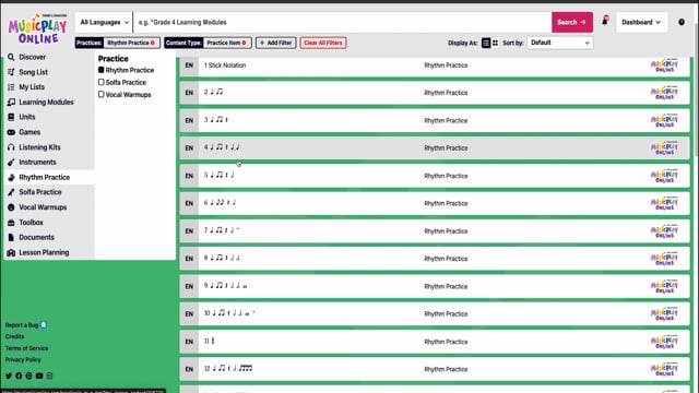 The rhythm practice section has multiple levels, activities, and assessment tools. It introduces different rhythms like three-four and four-four time signatures, along with various activities such as echo the rhythm, body percussion, animated play-alongs, and rhythm reading assessment. Assessments have been structured for ease of use in classrooms and address potential anxiety concerns. Additional activities like rhythm dictation and a Four Corners game are described as ways to engage students and reinforce rhythm skills.