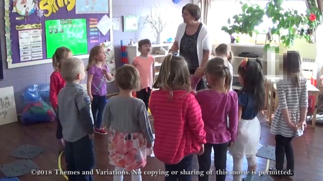 This is an opening song that can be used for each music class throughout the year or throughout the first 17 lessons. In PreK, you can teach songs by rote or teach them by immersion. In rote teaching, you sing a phrase (or play a phrase in the recording) and the children echo. Then you combine phrases until children can echo the entire song. When you teach by immersion, you sing the song (or play the recording) and have the children do a movement while listening to the song. If teaching this song by immersion tell the students to copy your movements while they listen to the song. After doing the movements for several lessons, they will have “caught” the melody and can sing along.